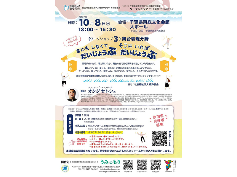 2025/09/26 | 研修会・相談会情報千葉県障碍者芸術文化活動支援センターうみのもりさんからご案内いただきました。 どなたでも参加可能《参加者・見学者 募集中》 ワークショップ3 舞台表現分野 なにもしなくて だいじょうぶ そこにいれば だいじ… 続きを読む