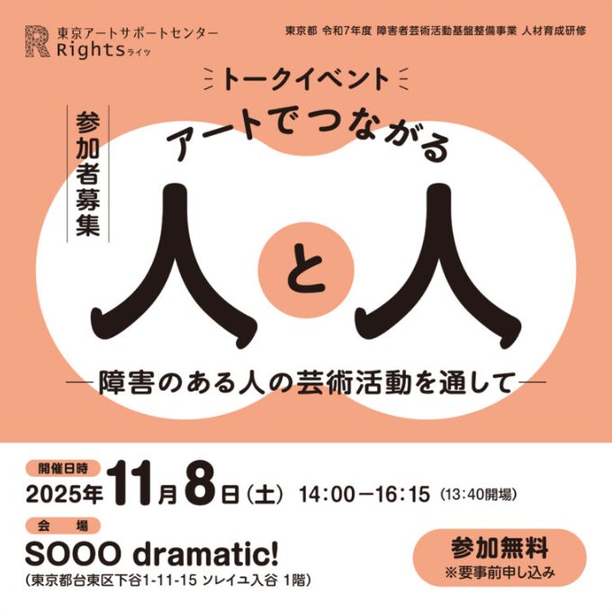 2025/10/7 | 展覧会・イベント情報東京アートサポートセンターRights(ライツ)さんよりご案内いただきました。 昨今、障害のある人の芸術活動の場が広がり、作品や表現を目にする場面も増えてきました。一方で、障害のある人と出会う/交流する場はまだまだ少ない… 続きを読む