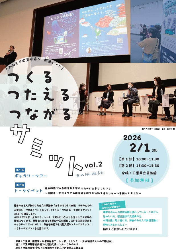 障害のある人が制作した作品の展覧会「あらゆるひとの表現 うみのもりの玉手箱5」の関連イベントとして、「つくる・つたえる・つながるサミットvol.2」を開催します。