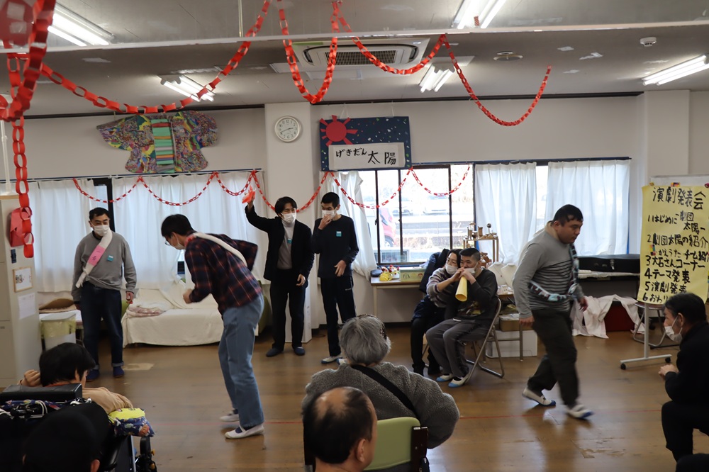 2023年に埼玉県の福祉施設、川口太陽の家で「演劇であたらしい表現をみつけるプロジェクト」を行いました。福祉とは異なる視点を持つ演劇のアーティストが関わることで、新しい表現が生まれるのではないかと始まったプロジェクトです。アートセンター集が主催で、藤原顕太さん(一般社団法人ベンチ)が企画とコーディネートをしてくださいました。 7月に顔合わせを兼ねて1回目のワークショップを行いました。まず驚いたのは、時間の使い方や遊び方に職員さんのアイデアがたくさんあること。普段の活動がそもそもクリエイティブだと感じました。8月はジェスチャーゲームや動きをまねする遊びなど、日常のレクリエーションの延長で演劇的なものに取り組んでもらいました。即興でリレー作文から劇をつくる試みも行い、とても盛り上がりました。9月と10月は「最高の一日」をテーマに集団で劇をつくり、2024年1月に発表会を開催しました。