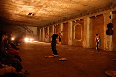 「踊りに行くぜ‼ in 舞鶴」(2009 年)。ダンサーの森下真樹さんと音楽家の宮嶋哉行さんによるパフォーマンスの様子。倉庫そのものを舞台装置とした多彩な芸術作品を展開。作品づくりでは、アーティストとともに市内の各所をリサーチし、作品テーマや協働相手を模索した